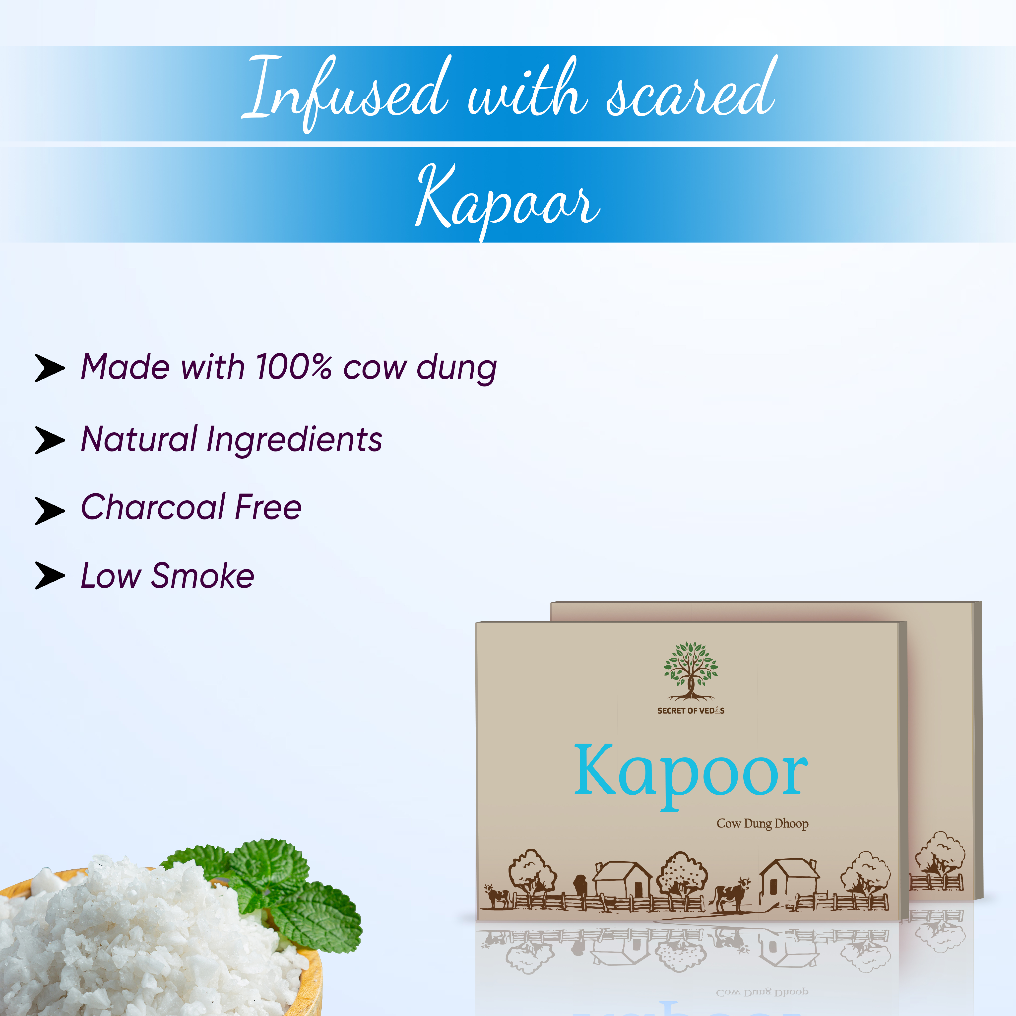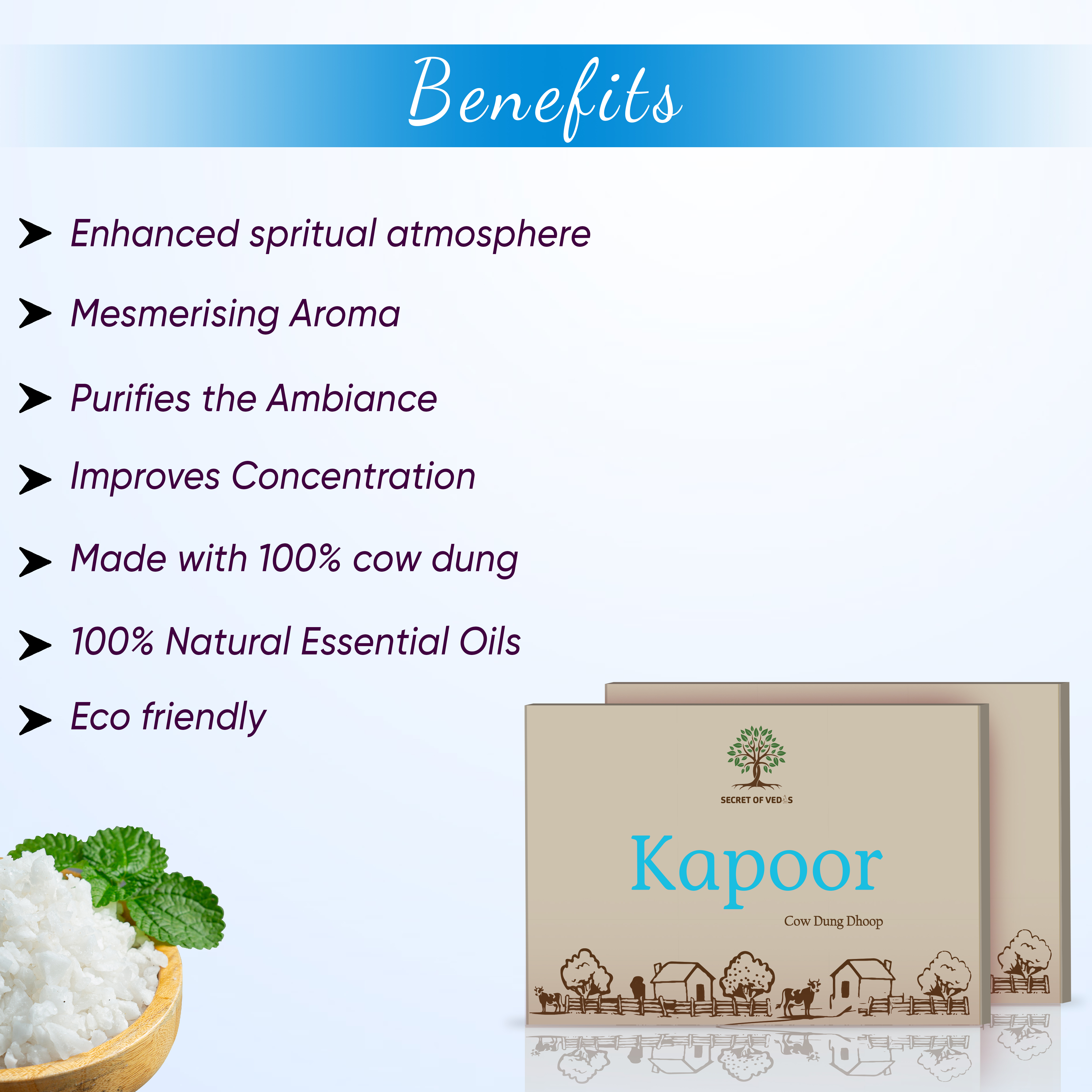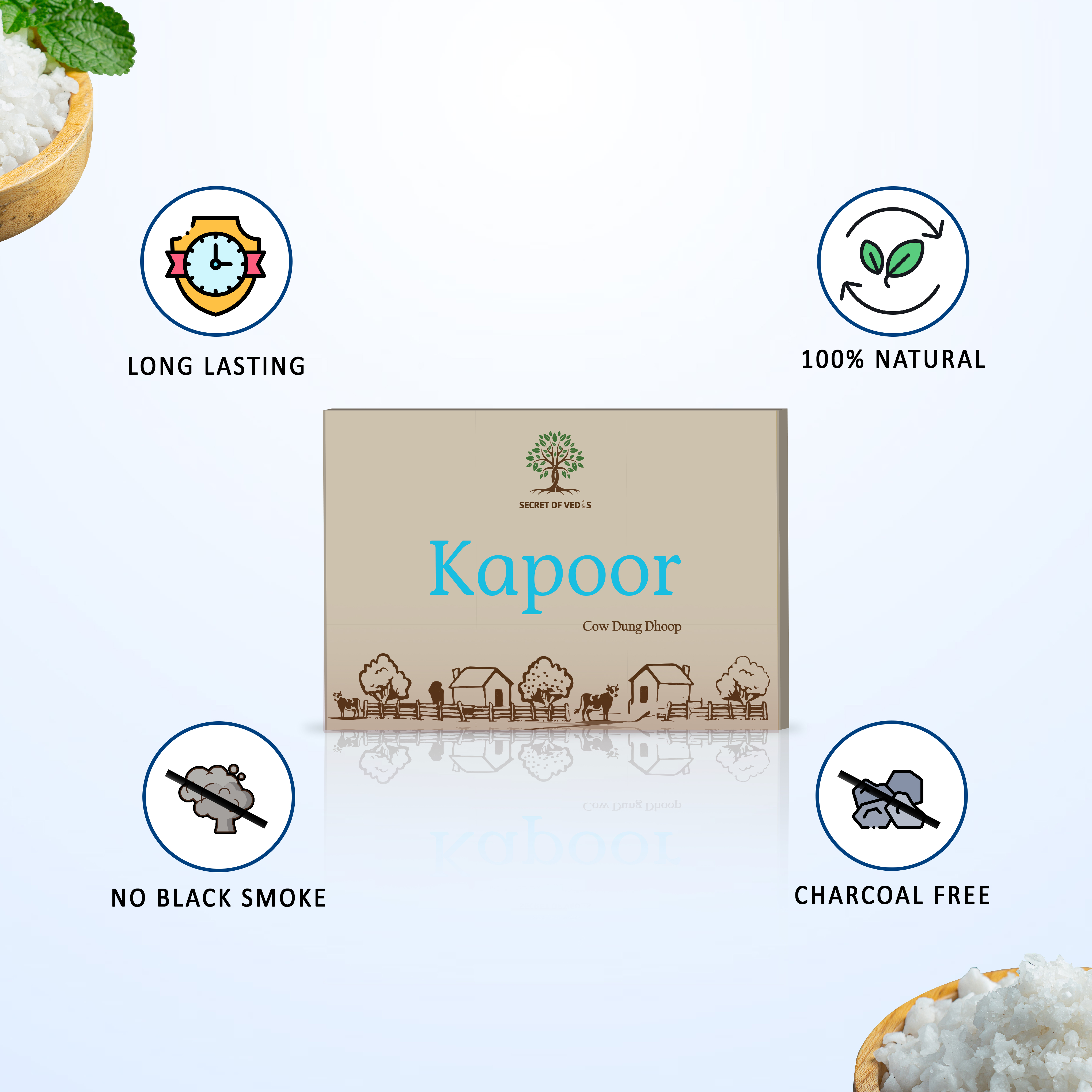 Kapoor Cow Dung Dhoop brings the refreshing purity of natural camphor combined with cow dung to create a soothing, spiritually energizing aroma. Its cooling, cleansing fragrance is believed to remove negativity and promote mental clarity.