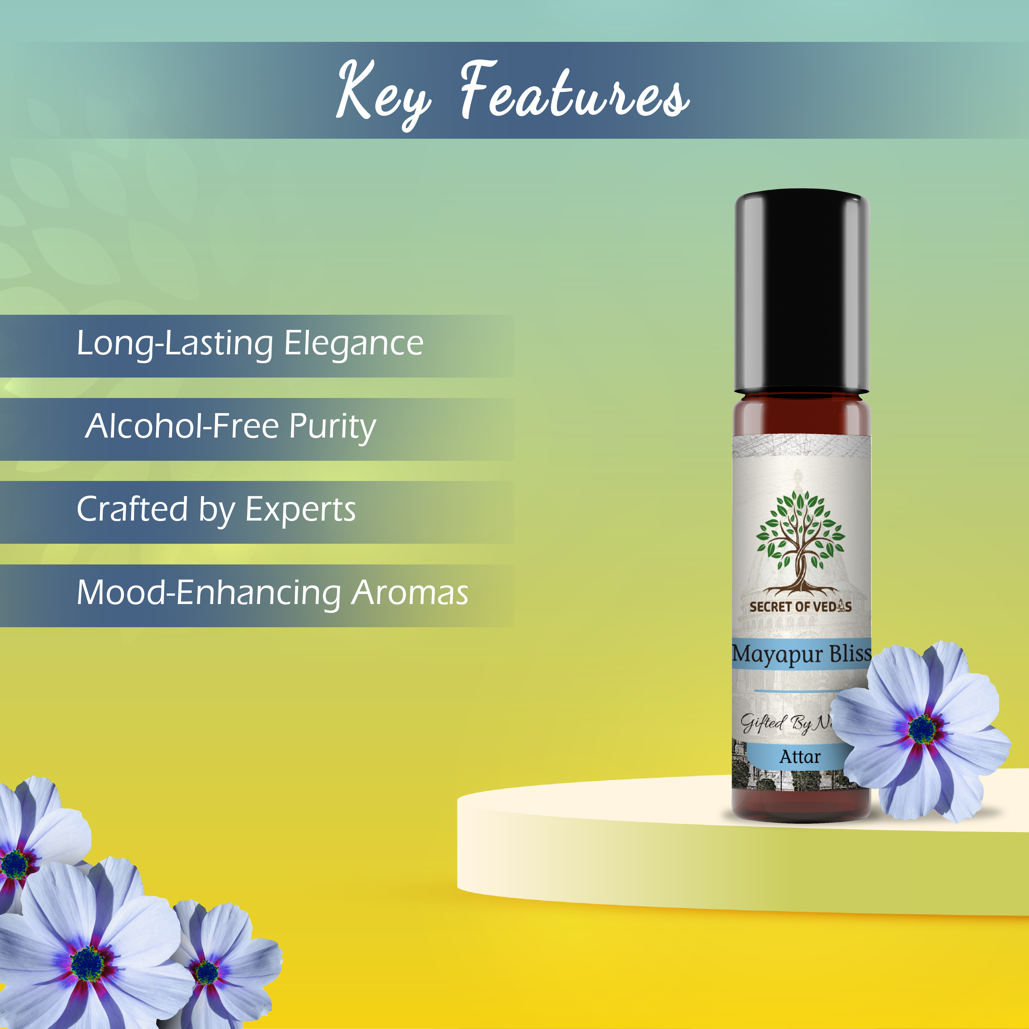 A soothing fragrance inspired by the serene atmosphere of Mayapur, Mayapur Bliss creates a calming effect, perfect for spiritual moments.